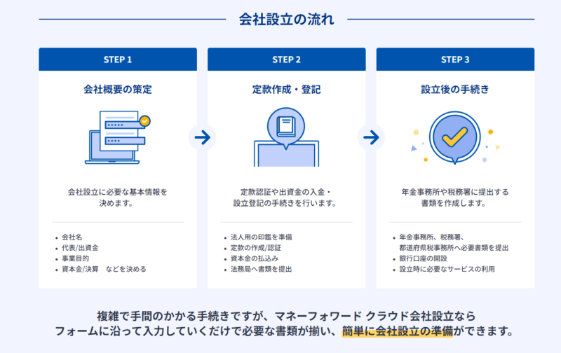 会社の設立には「マネーフォワードクラウド会社設立」というサービスを使用すると、気軽に間違えることなく、ご自身で会社の設立をおこなうことができます。