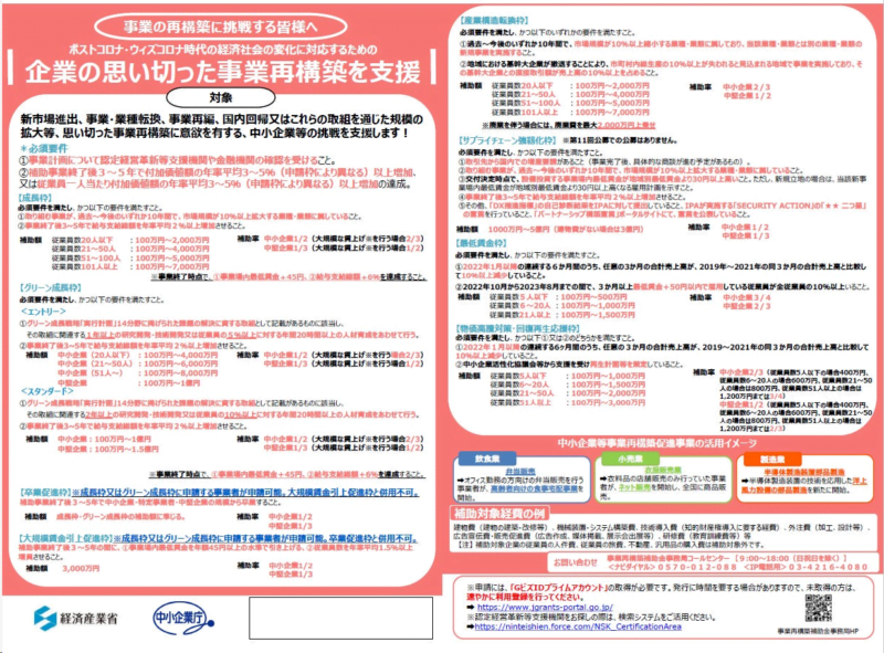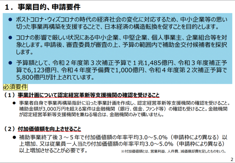 経済産業省が実施する補助金で「新分野展開や業態転換、事業・業種転換等の取組、事業再編又はこれらの取組を通じた規模の拡大等を目指す企業・団体等の新たな挑戦を支援」することが目的となっています。
