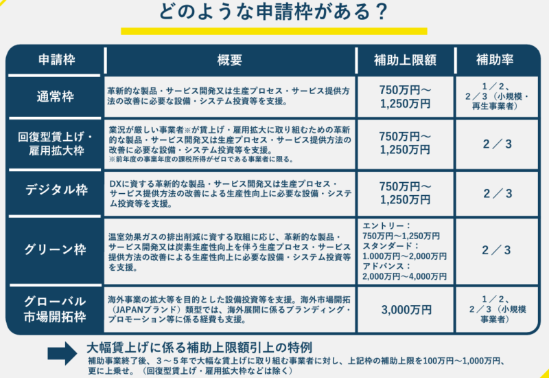 なお、ものづくり補助金には現在5つの申請枠が用意されています。
